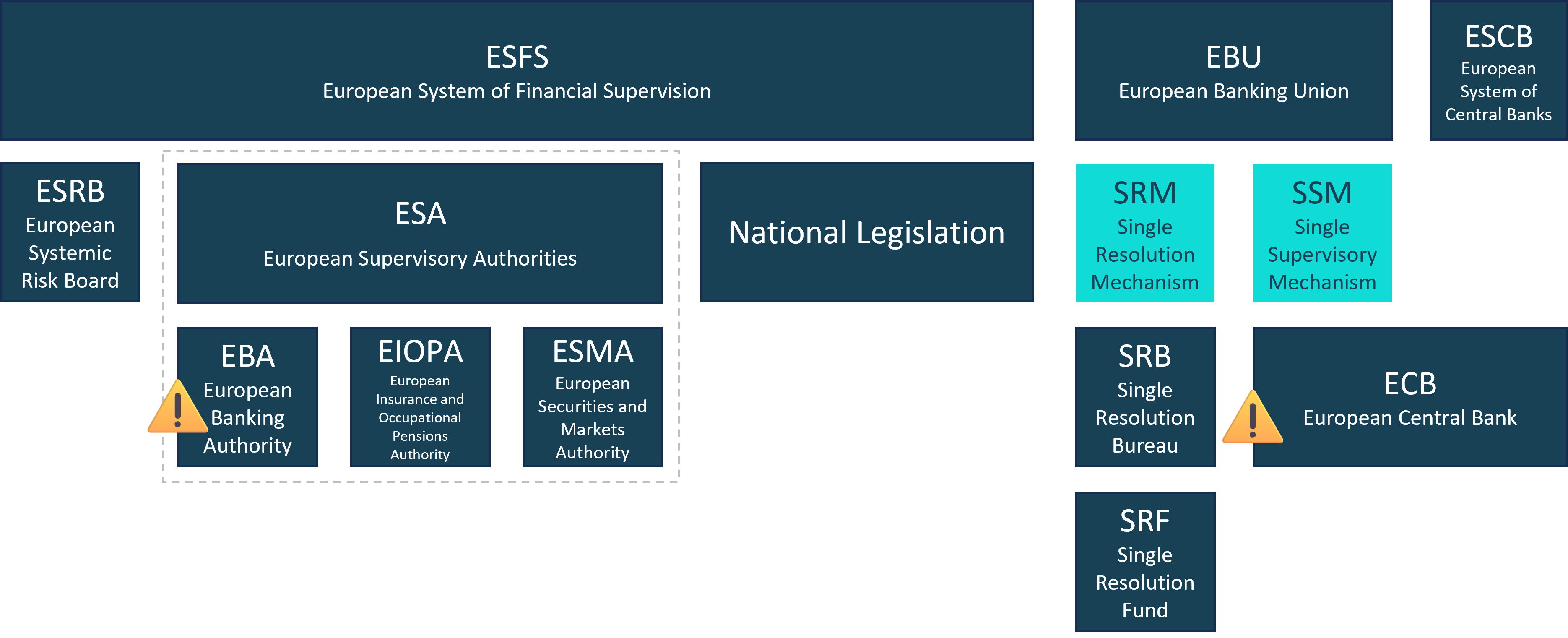 Together, these components form a robust regulatory architecture that not only safeguards the EU’s financial system but also strengthens trust and integration across member states. Besides of the regulation it is also important to set up an effective way on ensuring compliance to the regulation. The previous regulation can be put into context by having an overview of the European Union Authority overseeing the financial market.
