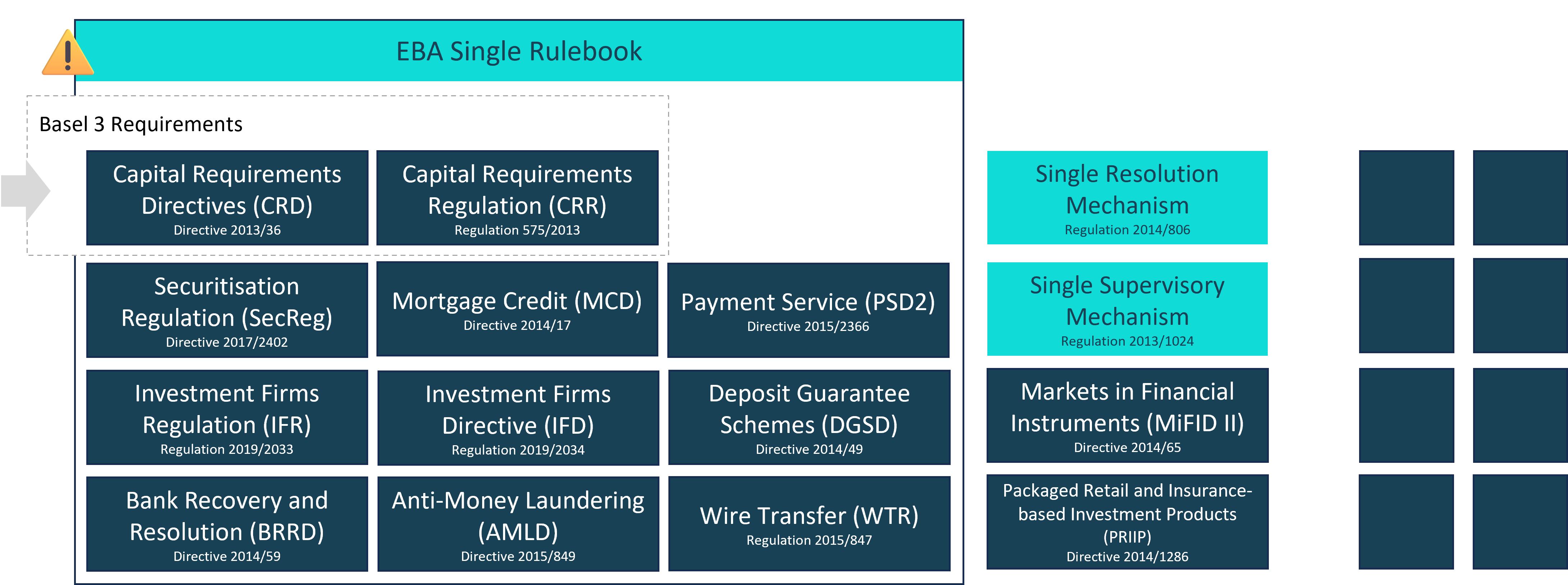 Created by the European Banking Authority (EBA), the Single Rulebook harmonizes prudential regulation across all EU member states. It ensures that banks operate under a consistent set of rules, closing loopholes and enabling fair competition. This framework translates Basel III standards into EU law and includes regulations like the Capital Requirements Regulation (CRR) and the Capital Requirements Directive IV (CRD IV).