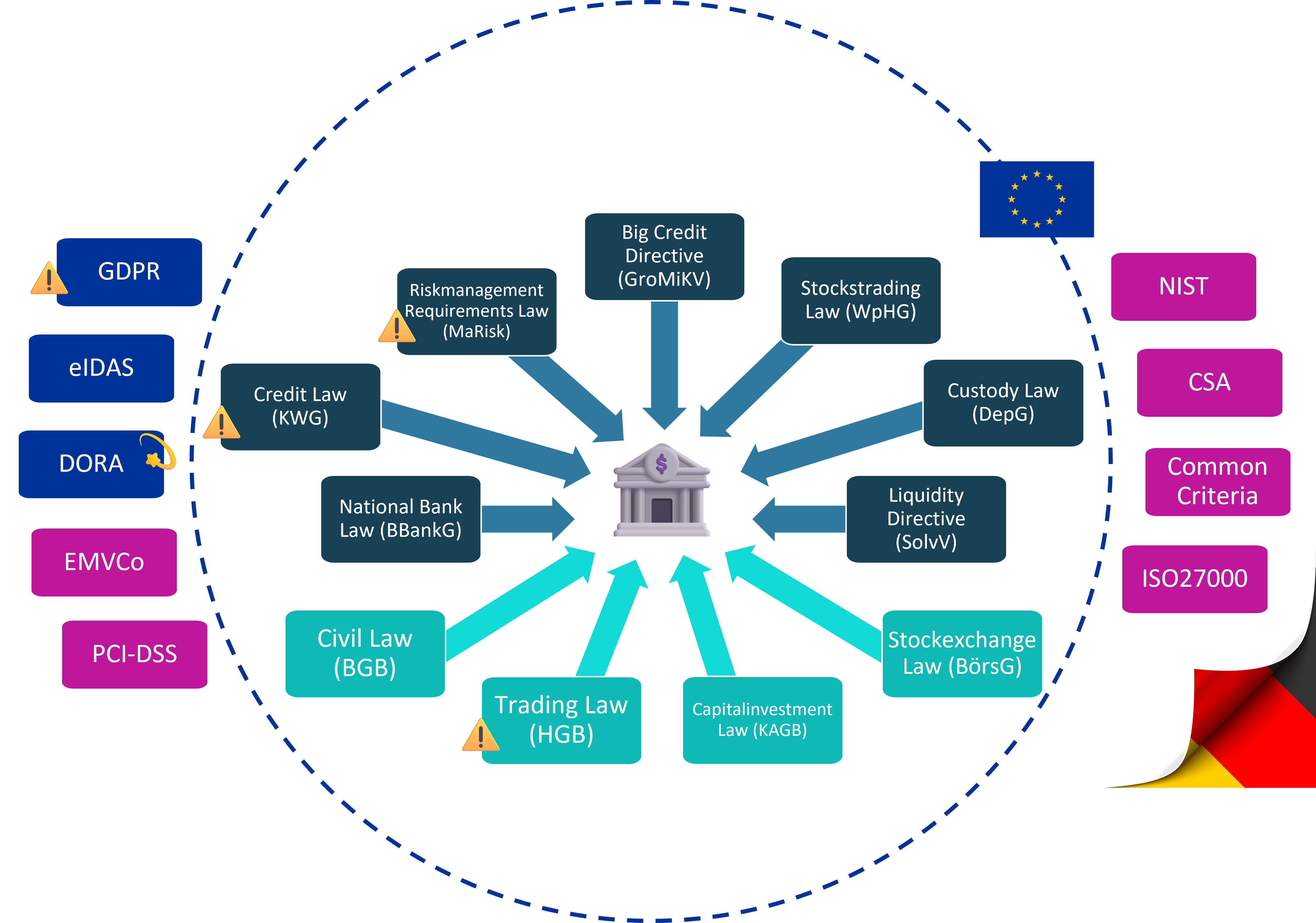 Together, with other national laws - like in Germany the Civil Law (BGB) or Credit Law (KWG) and others - these regulations form a multi-layered compliance landscape to have an effect on banking activities.