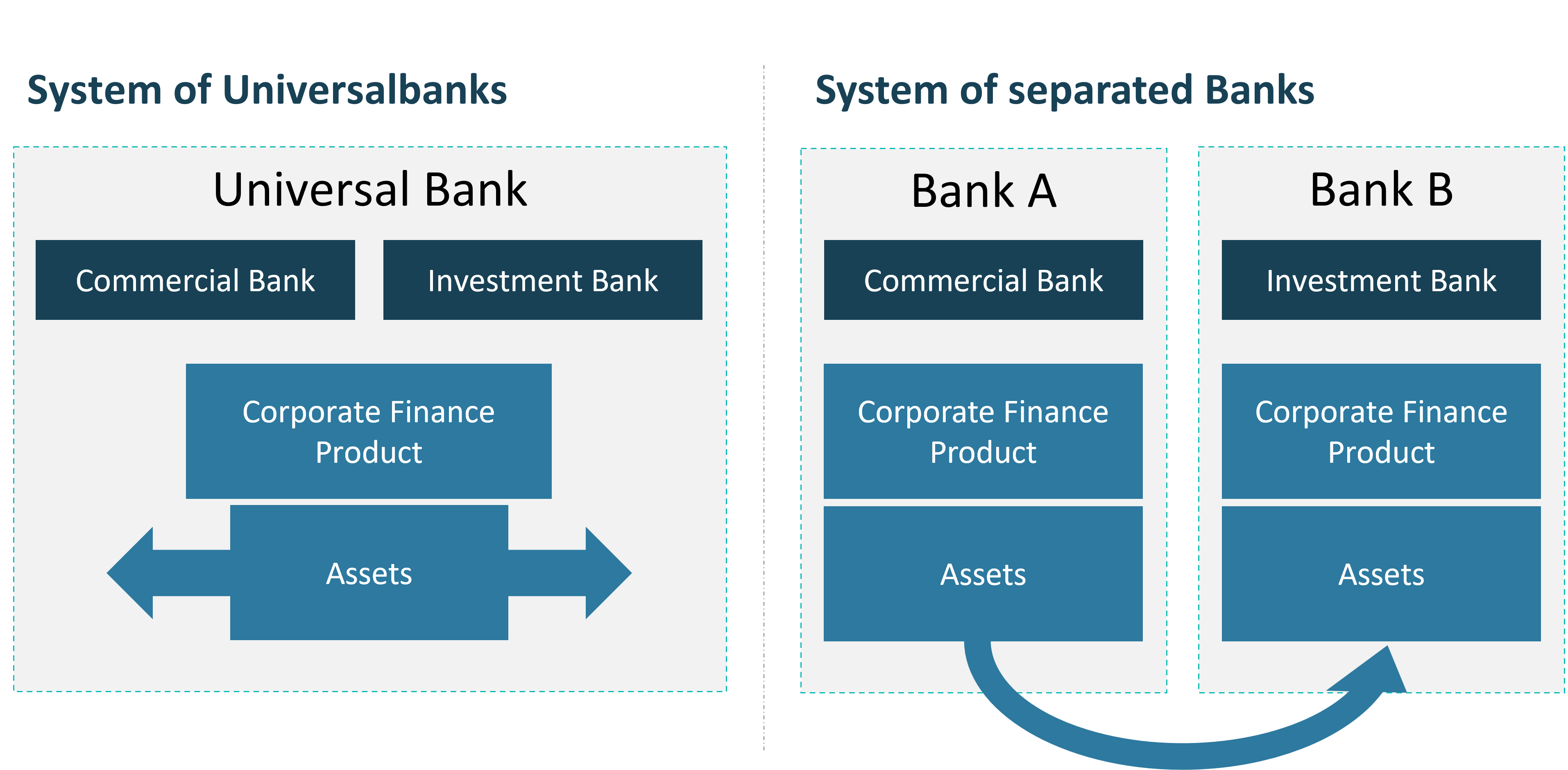 The system of seperated banks has its origin in the anglo-american market and devides Commercial Banking services from Investment Bank services by seperating them into different entities. Therefore a mix of assets is not possible anymore and clients need to keep relations with multiple company entities. The advantage of this concept is a highly specialized banks and therefore less risk exposure.