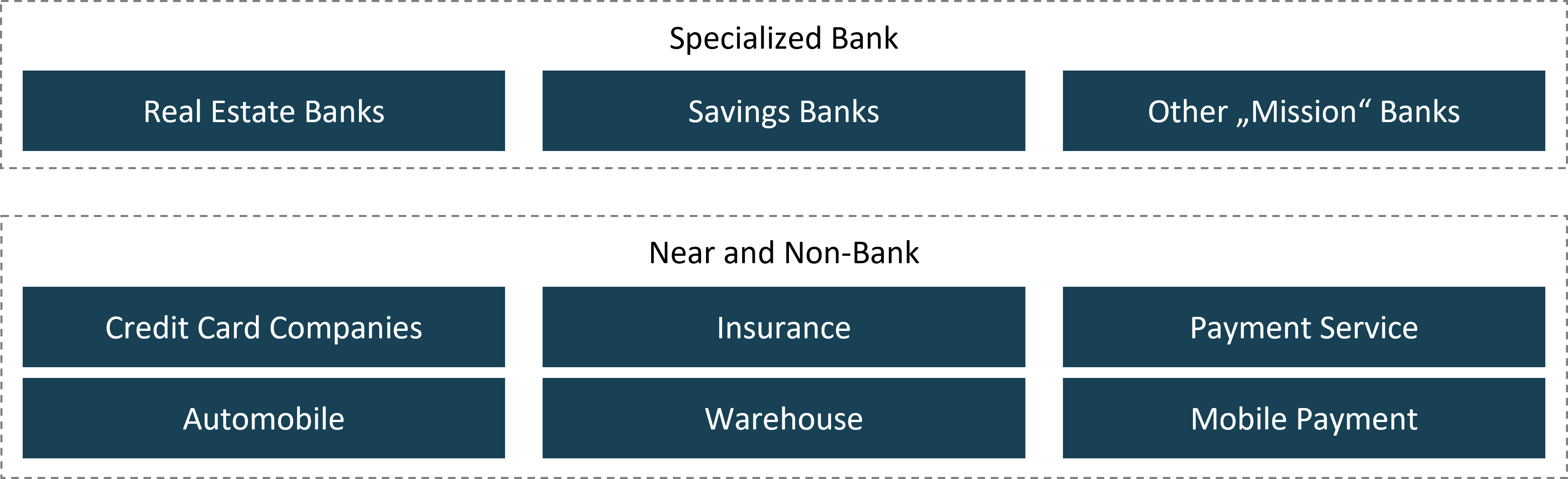 Besides this, there are several more types of banks, which usually specialize in a field or industry.